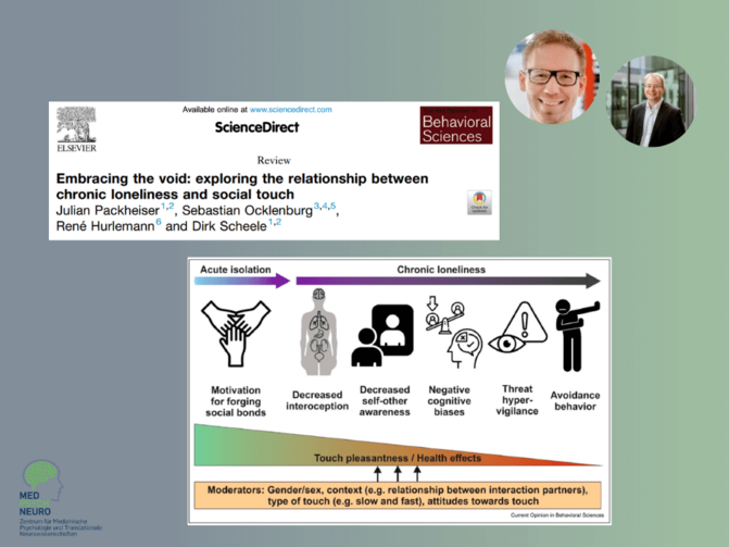 In unserem Artikel im Journal Current Opinion in Behavioral Sciences haben wir aktuelle Befunde zum Zusammenhang zwischen Einsamkeit und dem Erleben von Berührungen zusammengetragen. Außerdem haben wir ein Modell entwickelt, wie sich die Wahrnehmung und Wirkung von Berührungen je nach Dauer der bestehenden Einsamkeit unterscheiden.